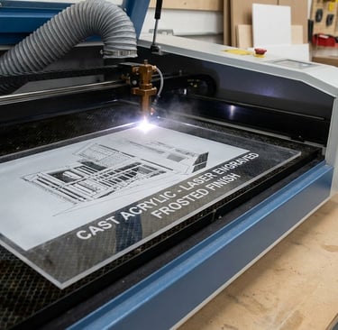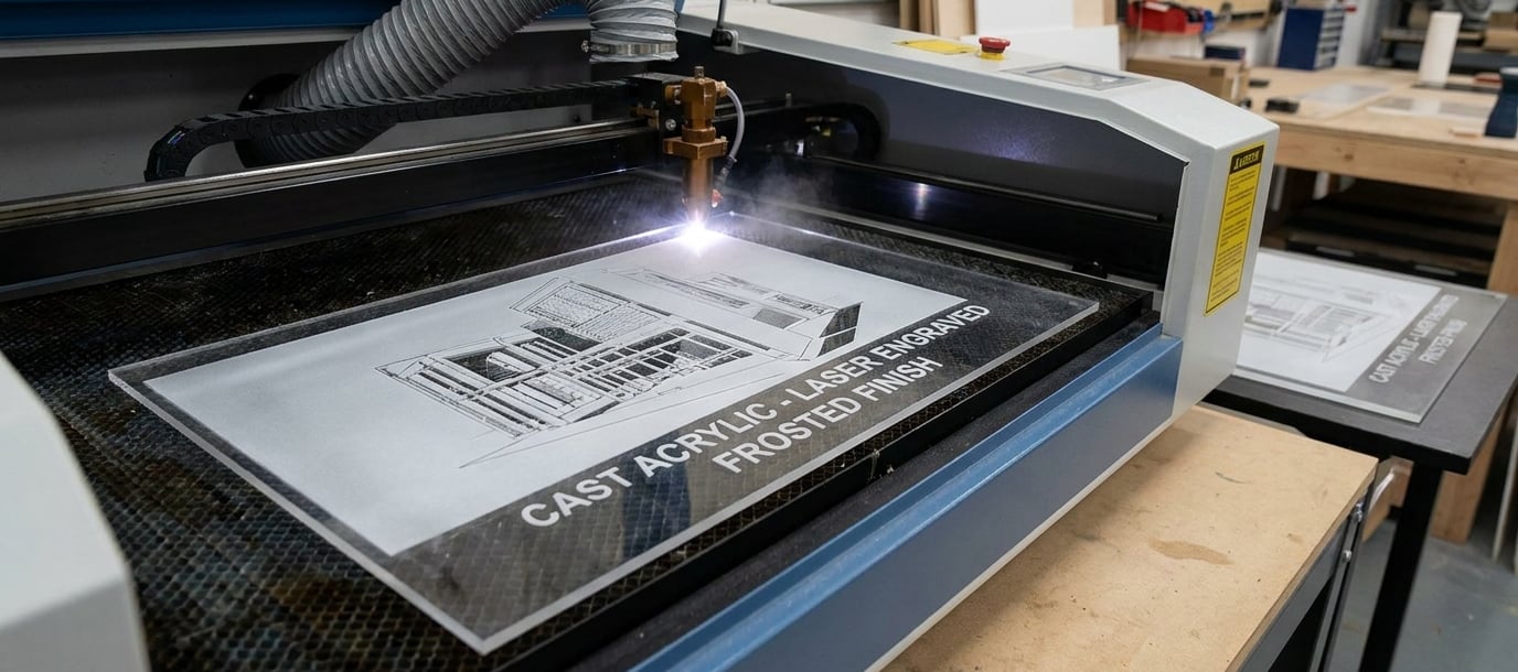 Лятият акрил е предпочитаният избор за гравиране, тъй като при обработка с лазер се постига матово бял, „мразовит“ ефект. Това създава отличен контраст, който е идеален за табели, награди и детайлни художествени проекти.